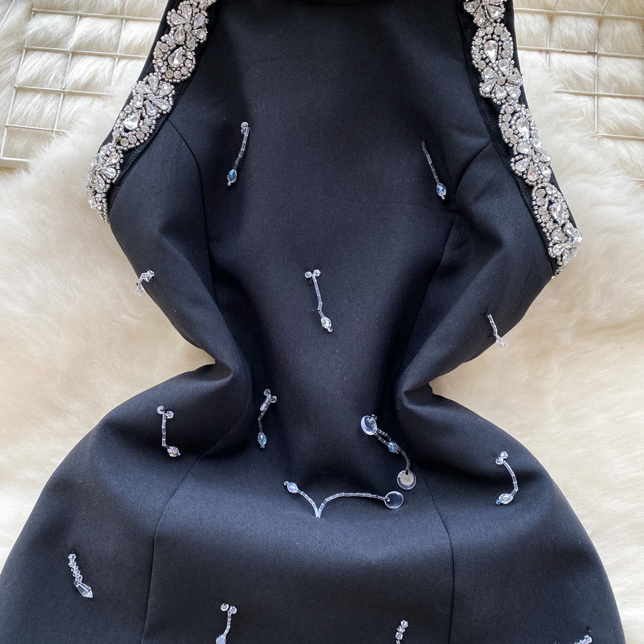 Experience luxe elegance with this stunning mini dress featuring sparkling crystal embellishments throughout, glamorous beaded neckline, sleeveless design, and classic black color. Perfect for cocktail parties, evening events, and special celebrations, this show-stopping dress combines delicate crystal details with sophisticated silhouette, designed to make you look absolutely radiant whether you're attending weddings, parties, or creating unforgettable occasion looks.