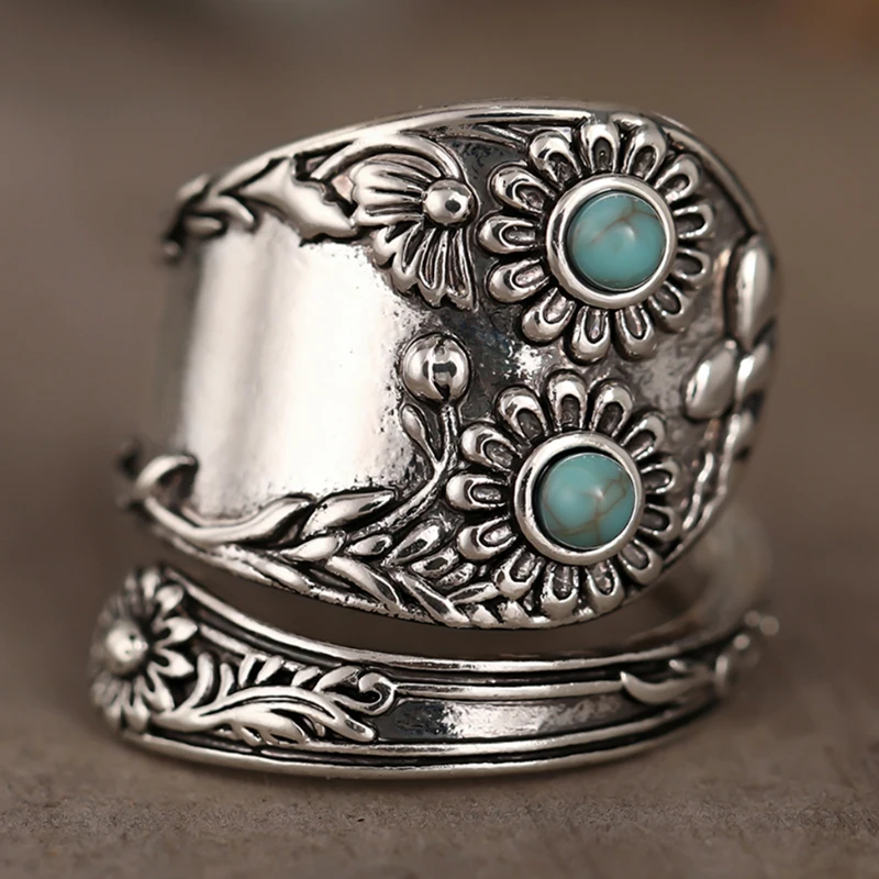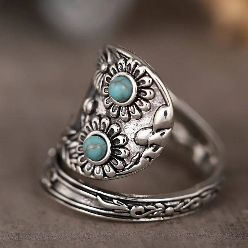 Boho Women’s Vintage Turquoise Flower Silver Ring