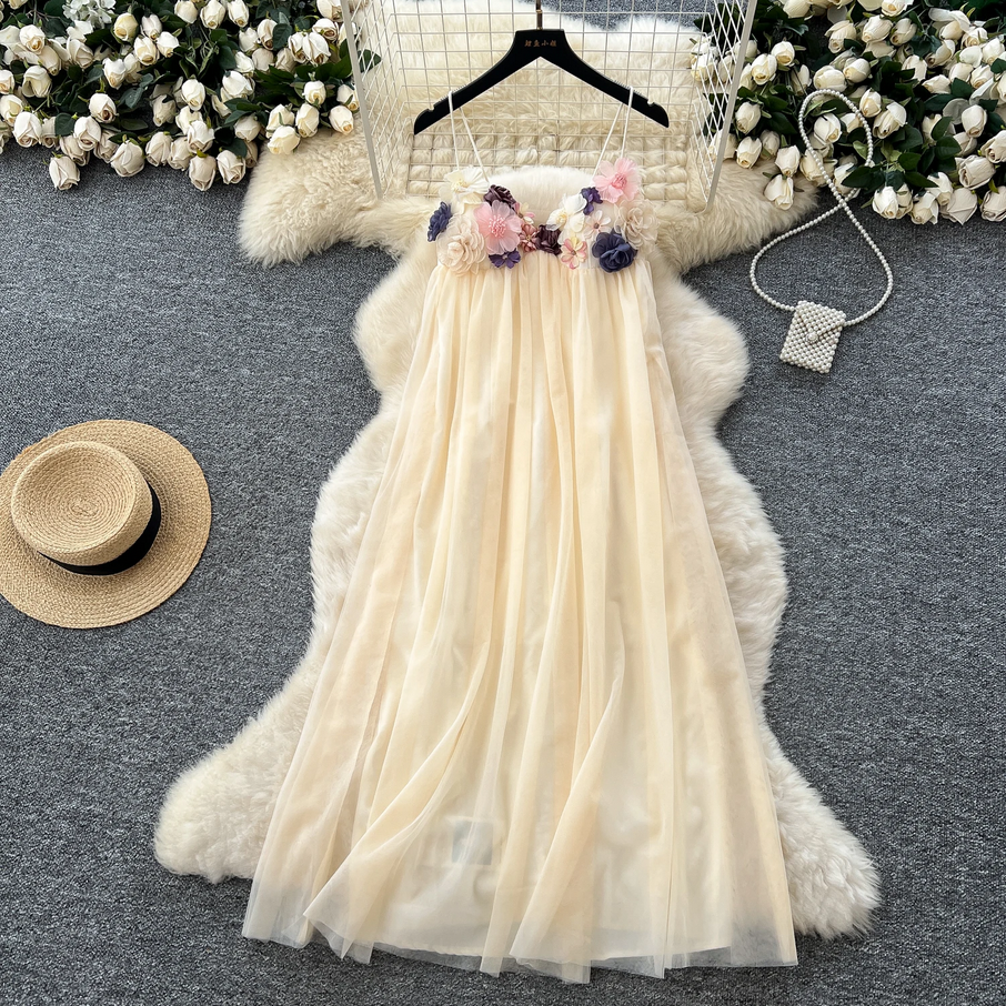 Float into fairytale dreams with this Cream 3D Floral Tulle Maxi Dress