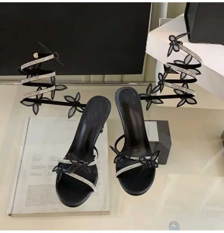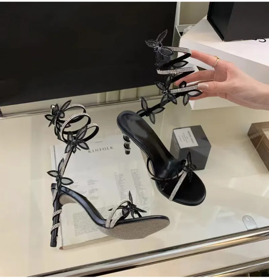 - Multiple 3D butterfly embellishments spiraling up the leg-wrap straps