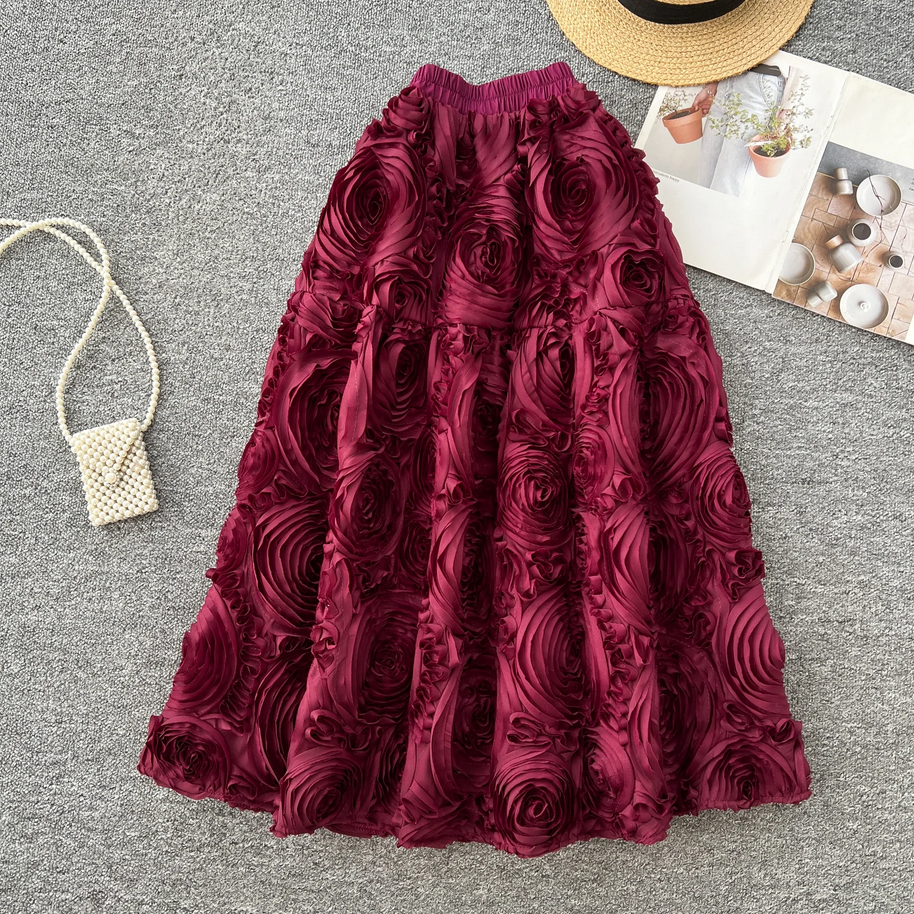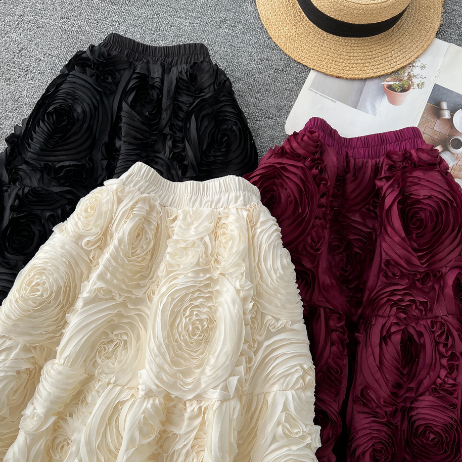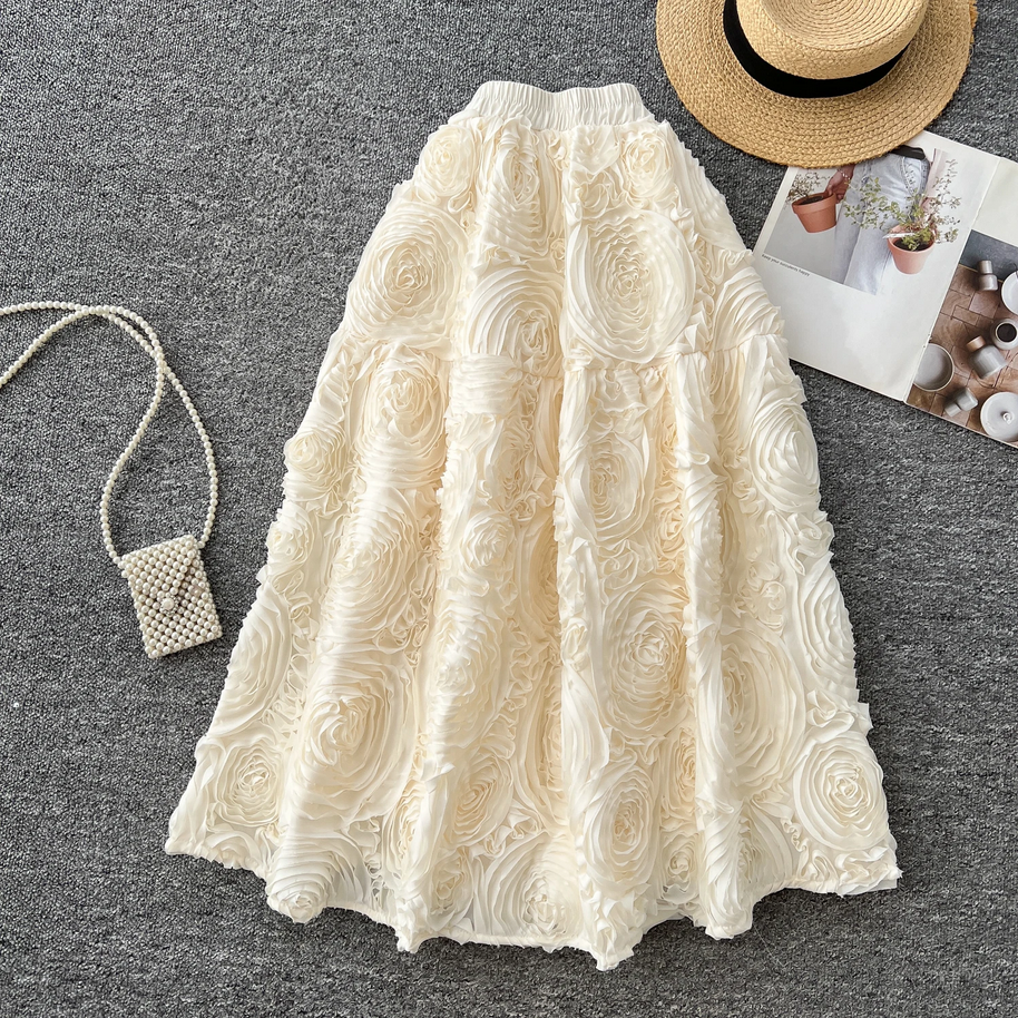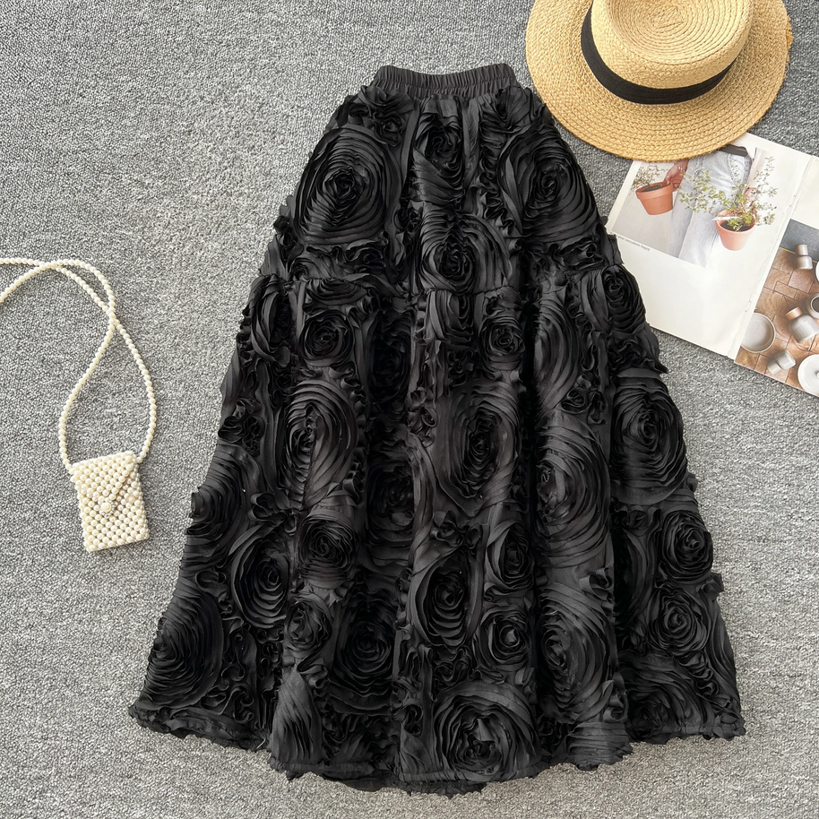 Elevate your wardrobe with this French chic 3D floral long skirt, featuring an elastic high waist and elegant design – perfect for casual or dressy occasions.