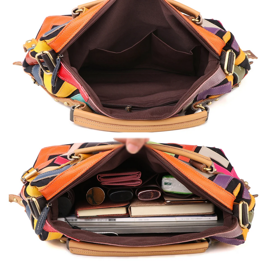 Stand out with this Women’s Leather Patchwork Handbag featuring a geometric multi-color design, rivet accents, and versatile shoulder or crossbody wear.