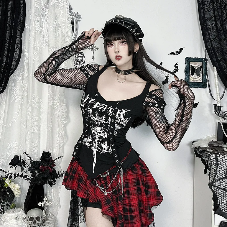 Embrace the perfect fusion of gothic edge, techwear innovation, and punk grunge attitude with this unique long sleeve top. Featuring eye-catching fishnet stitch detailing and alternative styling, this shirt is designed for the bold woman who loves to blend different dark aesthetics into one unforgettable look.