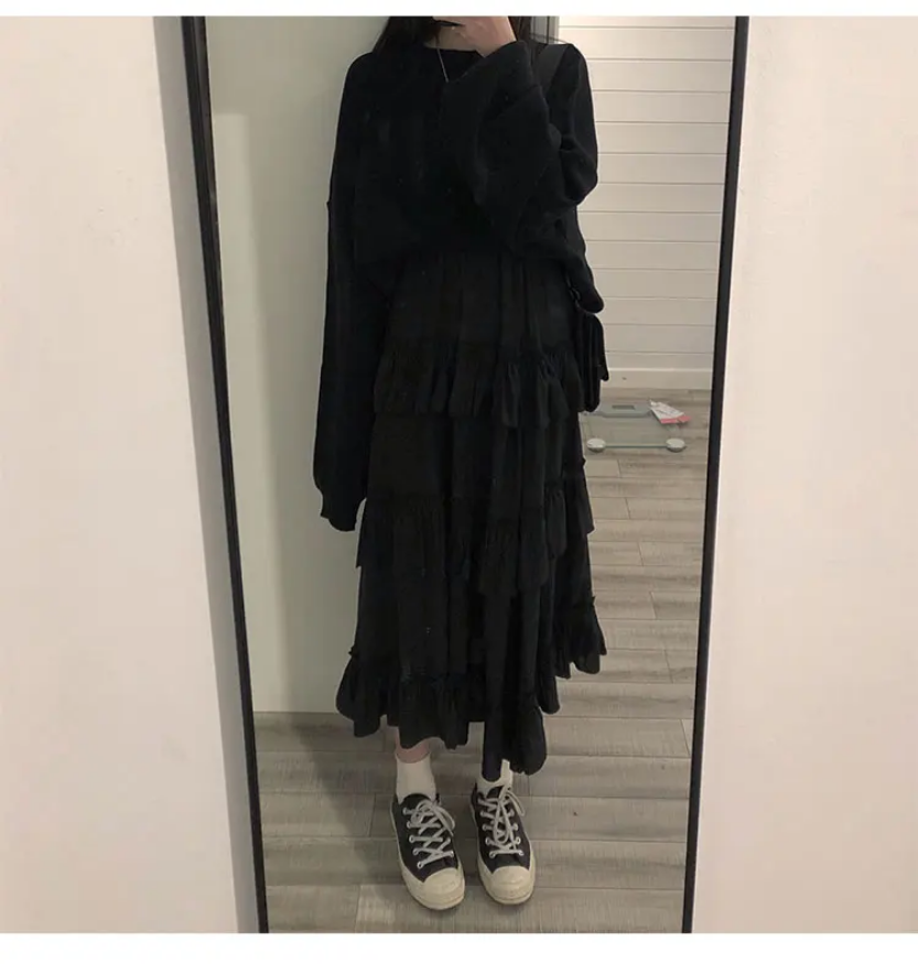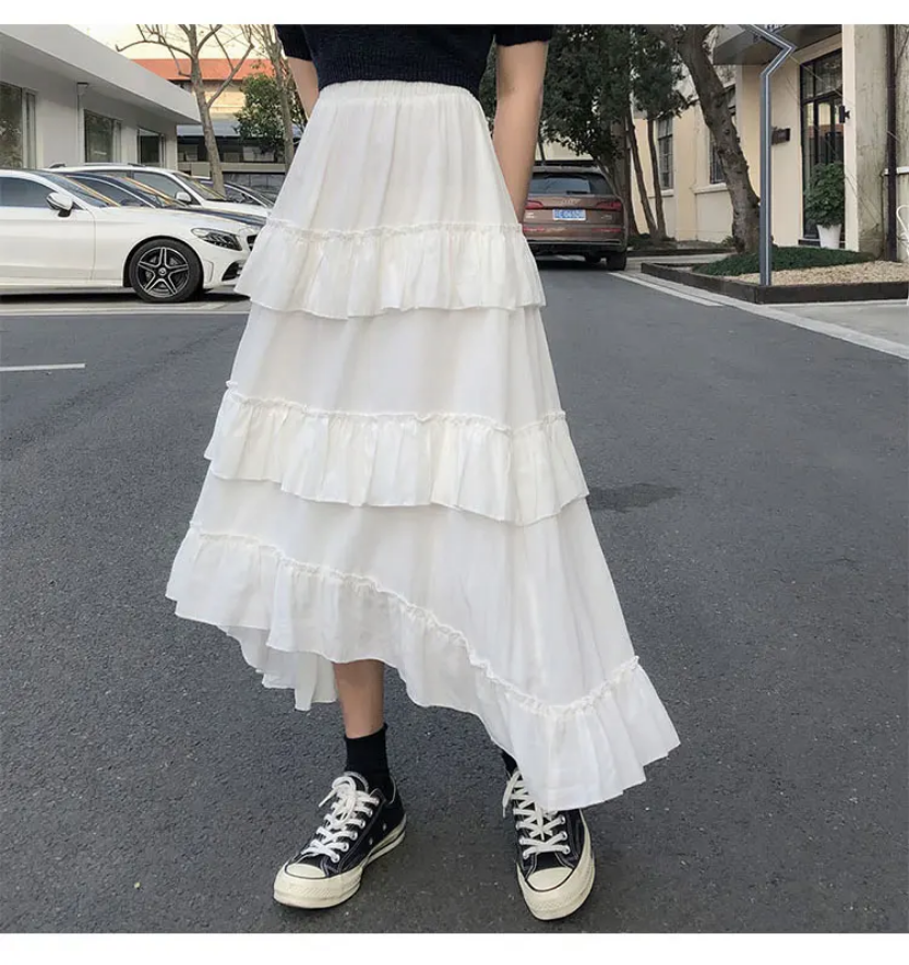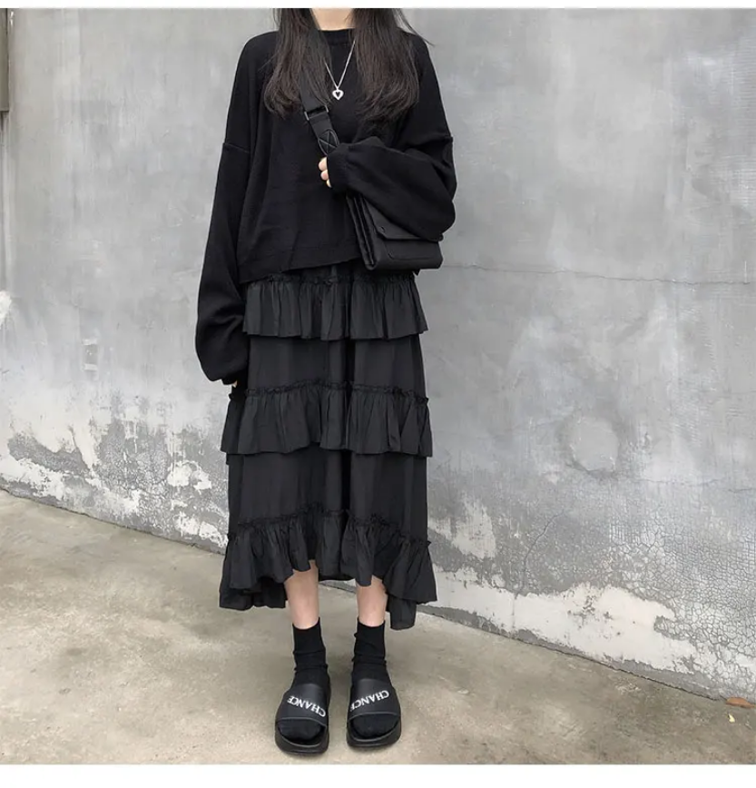 Elevate your gothic summer style with this High Waisted Asymmetrical Midi Long Skirt. Perfect for Lolita, goth, or vintage looks — chic, flowy, and comfortable for any occasion.