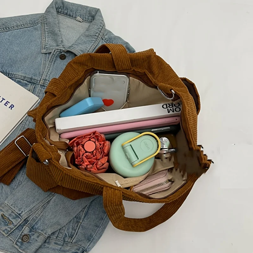 Experience effortless organization with this simple yet stylish corduroy shoulder bag featuring large capacity and multiple pockets for all your essentials. Perfect for everyday use, this casual bag combines the soft, textured appeal of corduroy with practical multi-pocket design, created for the woman who values both functionality and understated style in her daily accessories.