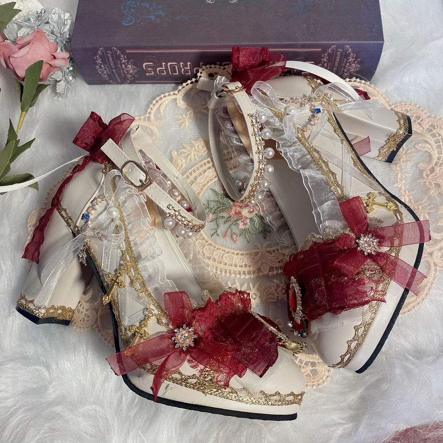 Make a regal entrance with these exquisite royal blue heels adorned with opulent baroque embellishments. Each shoe is a masterpiece featuring luxurious lace overlays, pearl-encrusted ankle straps, and dramatic sapphire-blue organza bows that capture the essence of Victorian romance.