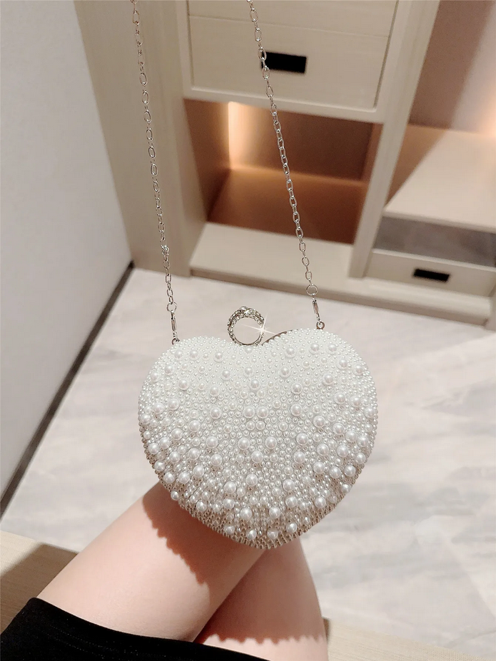 Elegant pearl evening bag with love design and chain strap. Perfect clutch for women at weddings, parties, and special occasions. Stylish and timeless.