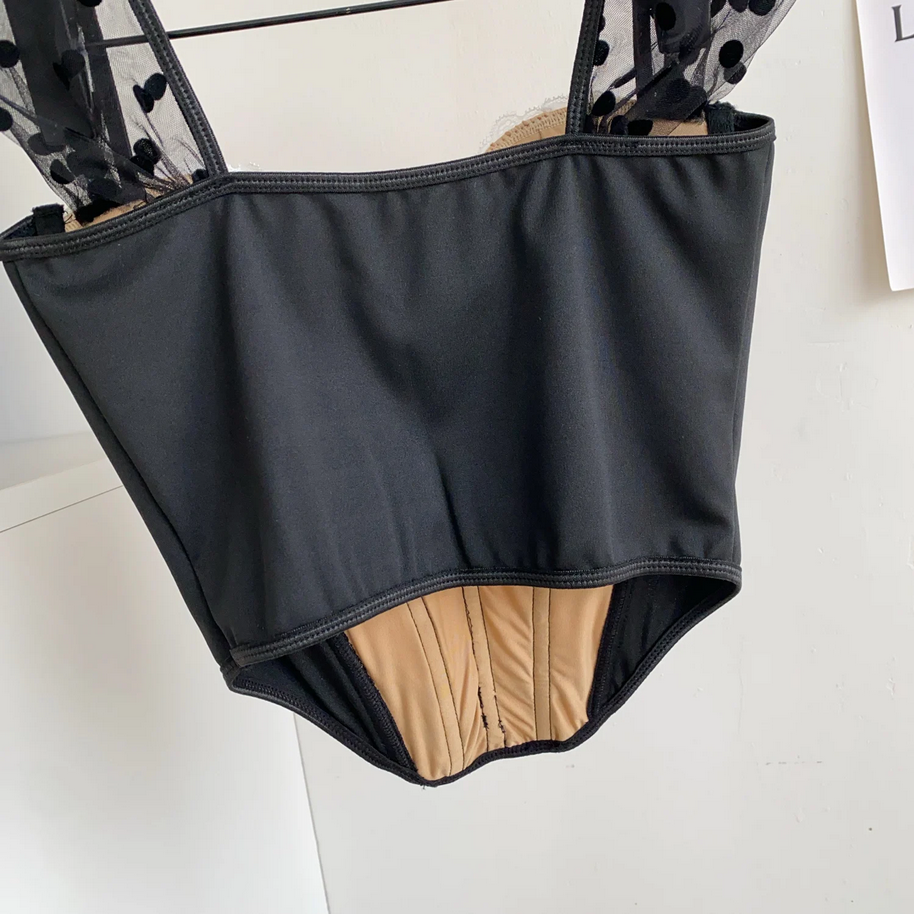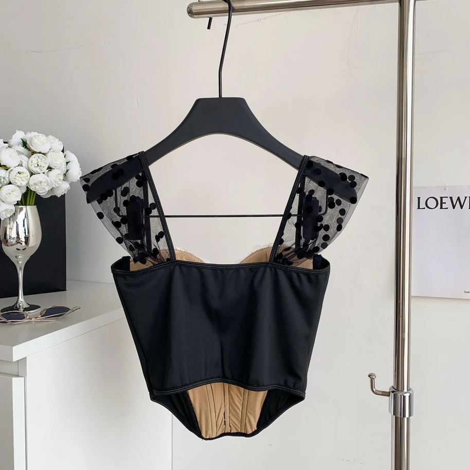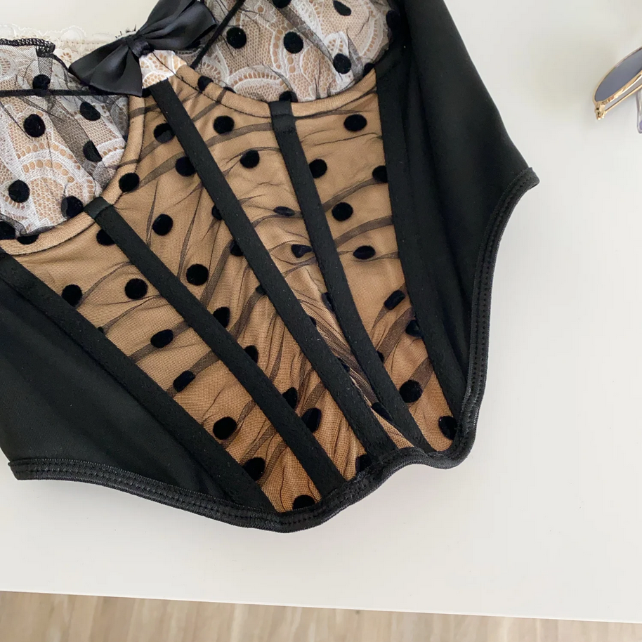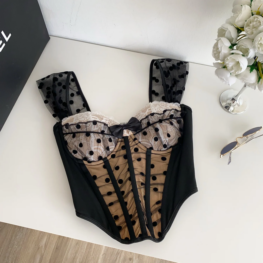 Whether you're going on a romantic date, attending a party, creating vintage-inspired outfits, or simply elevating your everyday style, this polka dot bustier cami delivers both charm and sophistication. The mesh and lace patchwork adds texture and visual interest while the classic polka dots ensure timeless appeal.