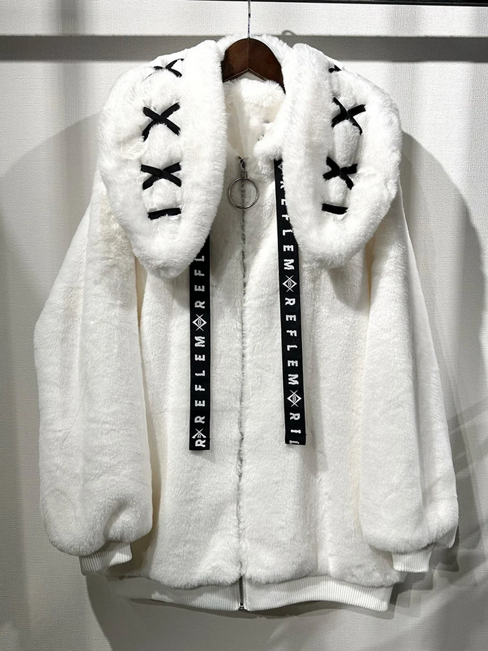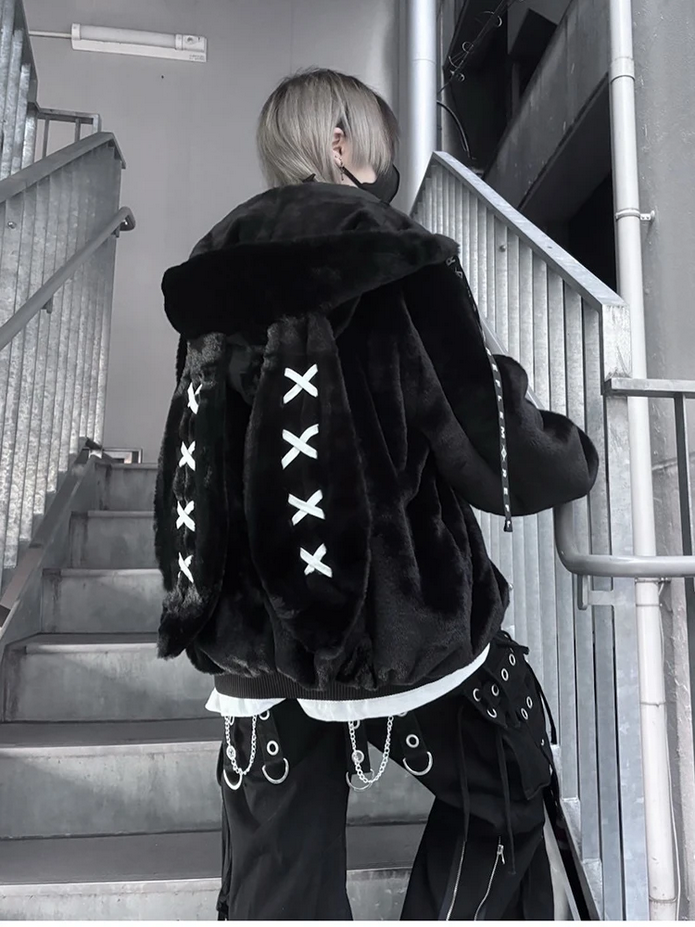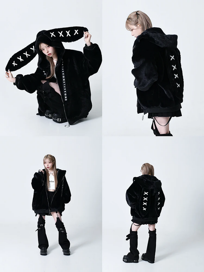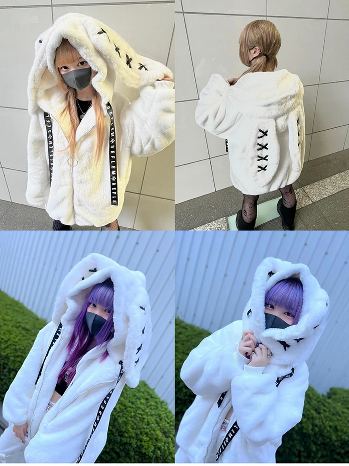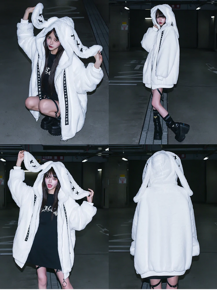 Stay cozy and cute in this kawaii white faux fur coat 🐰❄️. With thick fluffy fabric and adorable bunny ears, it’s perfect for winter fashion lovers.