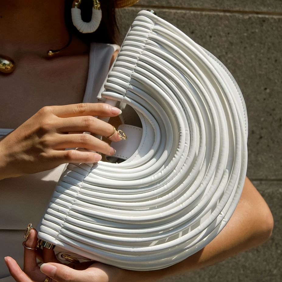 Make a bold style statement with this Luxury Designer Handwoven Noodle Bag, crafted with a unique half-round silhouette and intricate handwoven design. Finished in shimmering silver, this evening clutch is both sophisticated and fashion-forward. Its hobo-inspired structure ensures comfort, while the compact design keeps your essentials close. Perfect for weddings, cocktail parties, galas, or special occasions, this clutch adds an instant touch of elegant luxury to any outfit.