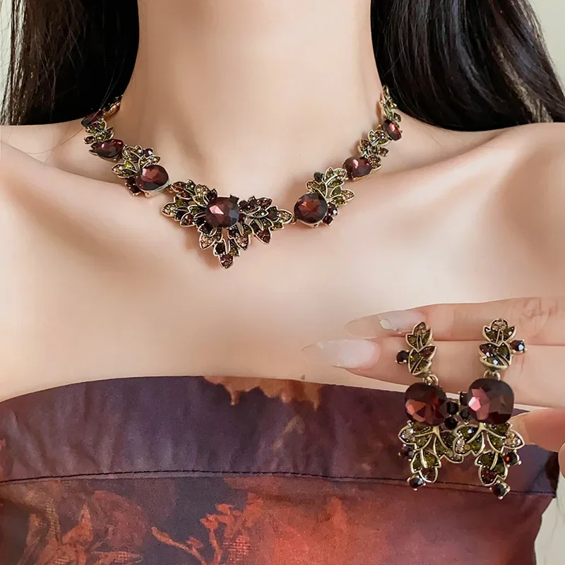 Women’s Vintage Brown Crystal Necklace & Earrings for Women